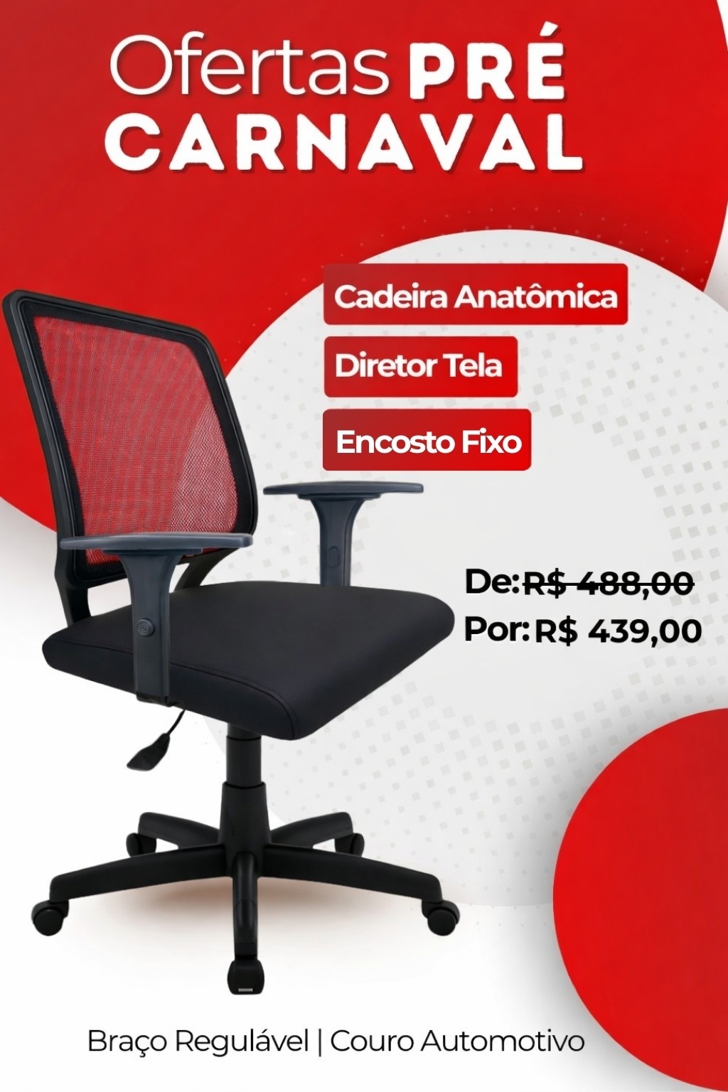 Encosto: tela mesh com estrutura reforçada em polipropileno e apoio lombar fixo.